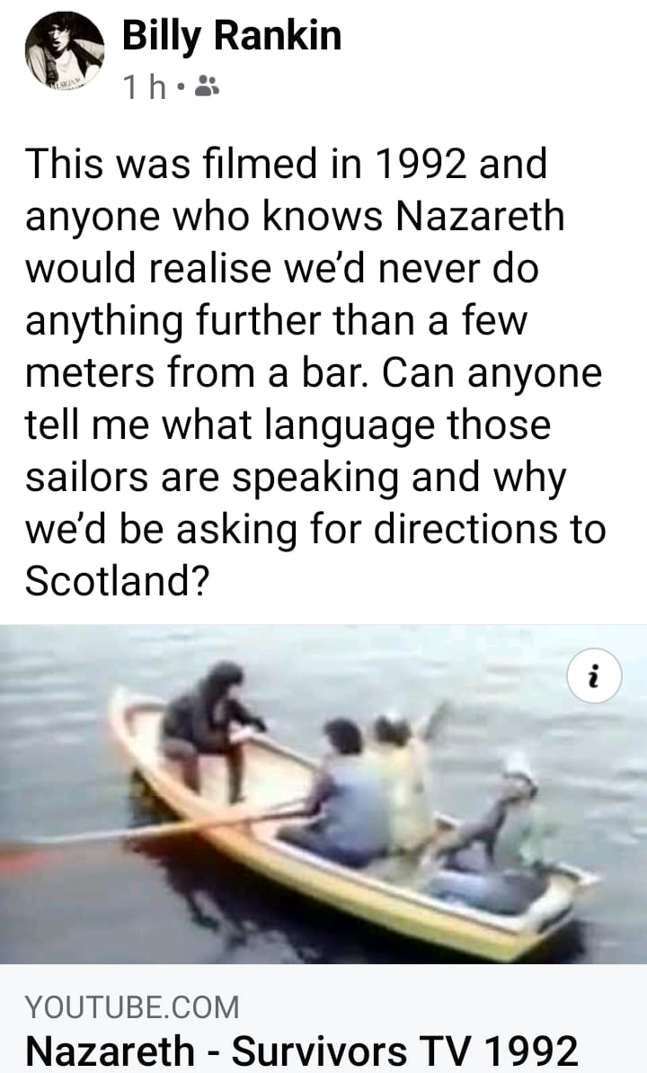Isso foi filmado em 1992 e qualquer pessoa que conheça Nazareth perceberia que nunca faríamos nada além de alguns metros de um bar. Alguém pode me dizer que idioma esses marinheiros estão falando e por que estaríamos pedindo informações para chegar à Escócia?